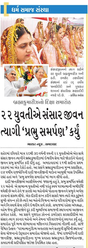 On Sunday, 31st October 2010, 22 girls aged from 20 to 30 years old were ordained as Brahma Kumaris in Ahmedabad, Gujarat, India. They left their respective families and dedicated their life to God. This was a record of 21st century in Ahmedabad. Raj yogini Dadi Janki, administrative Head of the BKWSU who is of 94 years age, was present especially from Mount Abu to participate in this dedication to God ceremony.