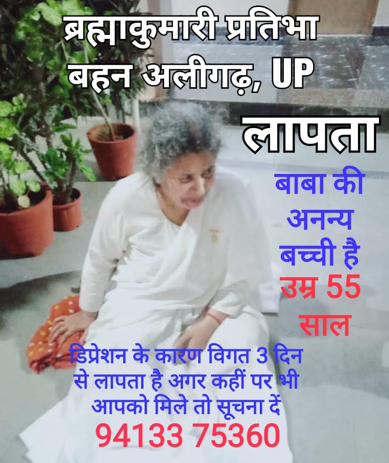 BK Pratibha, Aligarh, UP, India. Aged 55 Years. Missing since 1 week. Suffering from Depression. Moving in here and there alone.