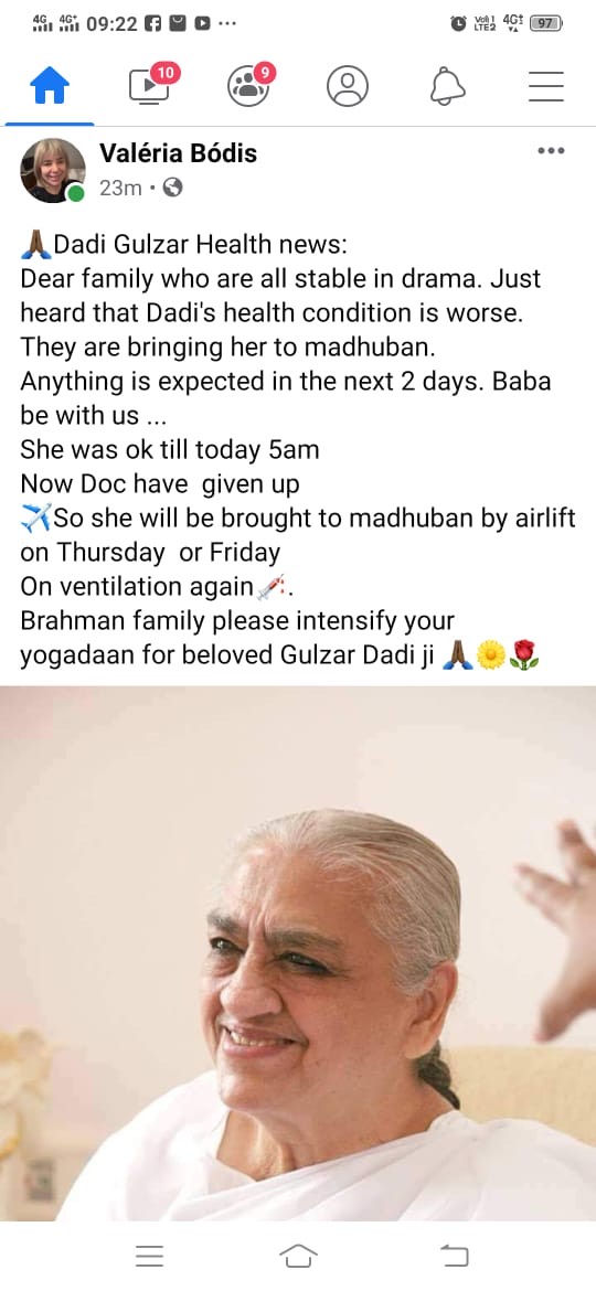 3 weeks after the Brahma Kumaris announced that Dadi Gulzarji’s health is gradually improving in order to fight "fake news", Gulzar dies. As the only official "medium of god", her passing signifies a major changing for the BKs. Will it mean a new spirit medium is announced, & the god of the BKs will come in a new "Chariot", or will it lead to the religion becoming even more abstract with no more personal meetings with god on earth? And what does this mean to the internal political dynamics of the BKWSU?