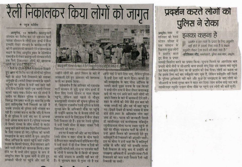 From the newspaper reports we can know that they took out a peaceful rally. But personal accounts of PBKs who attended that rally reveal that although the PBKs had given written information to the local police about their motives, there was a huge posse of Police on the day of rally in Abu Road outside Shantivan.