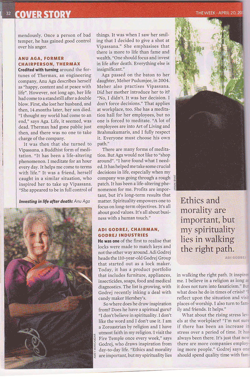 Omshanti. The latest issue of The Week magazine, which is one of the reputed and best-selling weekly magazines of India carries a cover story titled "CEOs and spirituality - India Inc. embraces the new mantra" and includes the examples of how some of the top Indian CEOs cope with stress.