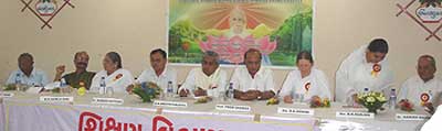 The two Distinction Students Mehulkumar Thakkar, Lecturer in the MBA programme of Srimat Raj Chander Institute of Management and Computer Application, and Pankaj Gandhi, Post Graduate Lecturer and professional in Management, receive special mementos from Sarla Didi. Vice Chancellor, Rameshchandra G. Kothari, expressed his full support and cooperation for introducing the Diploma of Education in Values and Spirituality.