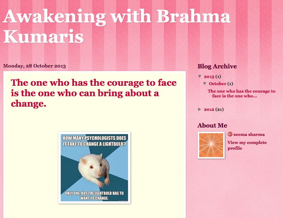 The Brahma Kumaris organization is an International NGO having consultative status with United Nations and it has been redndering spiritual services since 1936. It has more than 10 lakh followers in more than 140 countries and The Knowledge shared by the organization has attained a reputation par excellence.