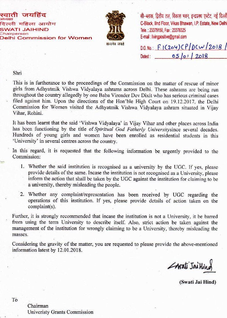 "It has been learnt that the said 'vishwa vidyalaya' at Vijay Vihar and at other places across India has been functioning with the title of Spiritual God Fatherly University for decades.
