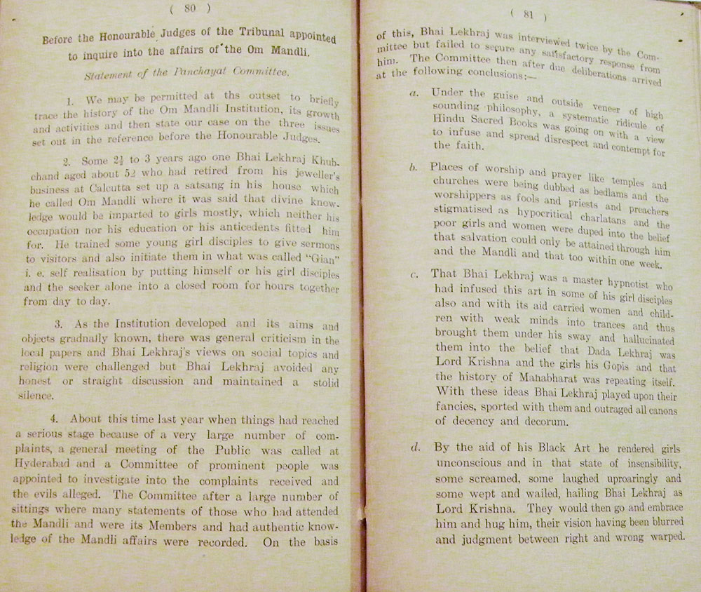 The founder of the Om Mandli Bhai Lekhraj is a master of hypnotism and some of the Sakhies have also been trained by him into that nefarious art. With the aid of this Black Art, he, with his powerful gaze thrown from his magic laden eyes hypnotises youthful women and when they are completely under his sway, he sports with them, plays "Krishna, Lila", makes them dance, rocks them in swings, exchanges with them morsels of food, embraces them, bathes with them in the same tank, in short outrages commons of decency