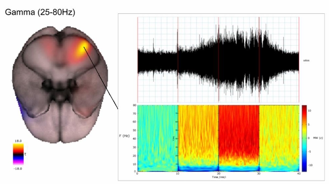 What is clear from this study is that meditation is an active process, which directly modulates the oscillatory activity of the brain. The findings from a single participant demonstrated up to 180% change in oscillatory power (in the gamma frequency range), which is orders of magnitude greater than any MEG study has previously reported.