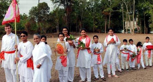 A group of 14 young children participated in the ceremony. Leading them is Brahma Kumaris south central U.S. director, Dr. Hansa Raval.