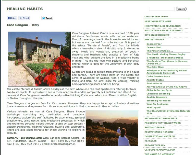 Casa Sangam Retreat Centre is a restored 1300 year old stone farmhouse, made with natural materials. Most of the energy used in the house for electricity and hot water are derived from solar sources. It is part of the estate "Tenuta di Fassia", and from it's hillside offers a marvellous view of Gubbio, only 6 kilometres away. Meals are vegetarian, prepared by yogis - students and teachers who practice a form of Raja Yoga and who prepare the food in a meditative frame of mind. This fills the food with positive and beneficial energy, which is good for the upliftment of both body and mind.