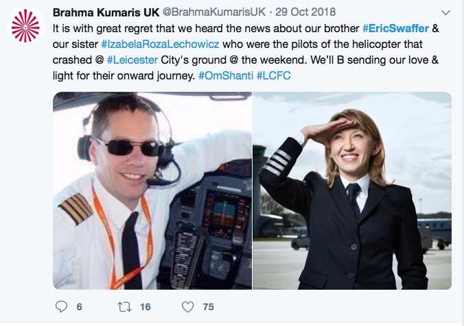 While the city of Leicester was stunned by a tragic helicopter crash that killed 5, including the sponsor of one of the greatest sporting accomplishments in British history, the BK trustees and leader Sister Jayanti were apparently salvating over the Estate of the pilot and co-pilot, Eric Swaffer and Izabela Lechowicz, both Brahma Kumari adherents to some degree.