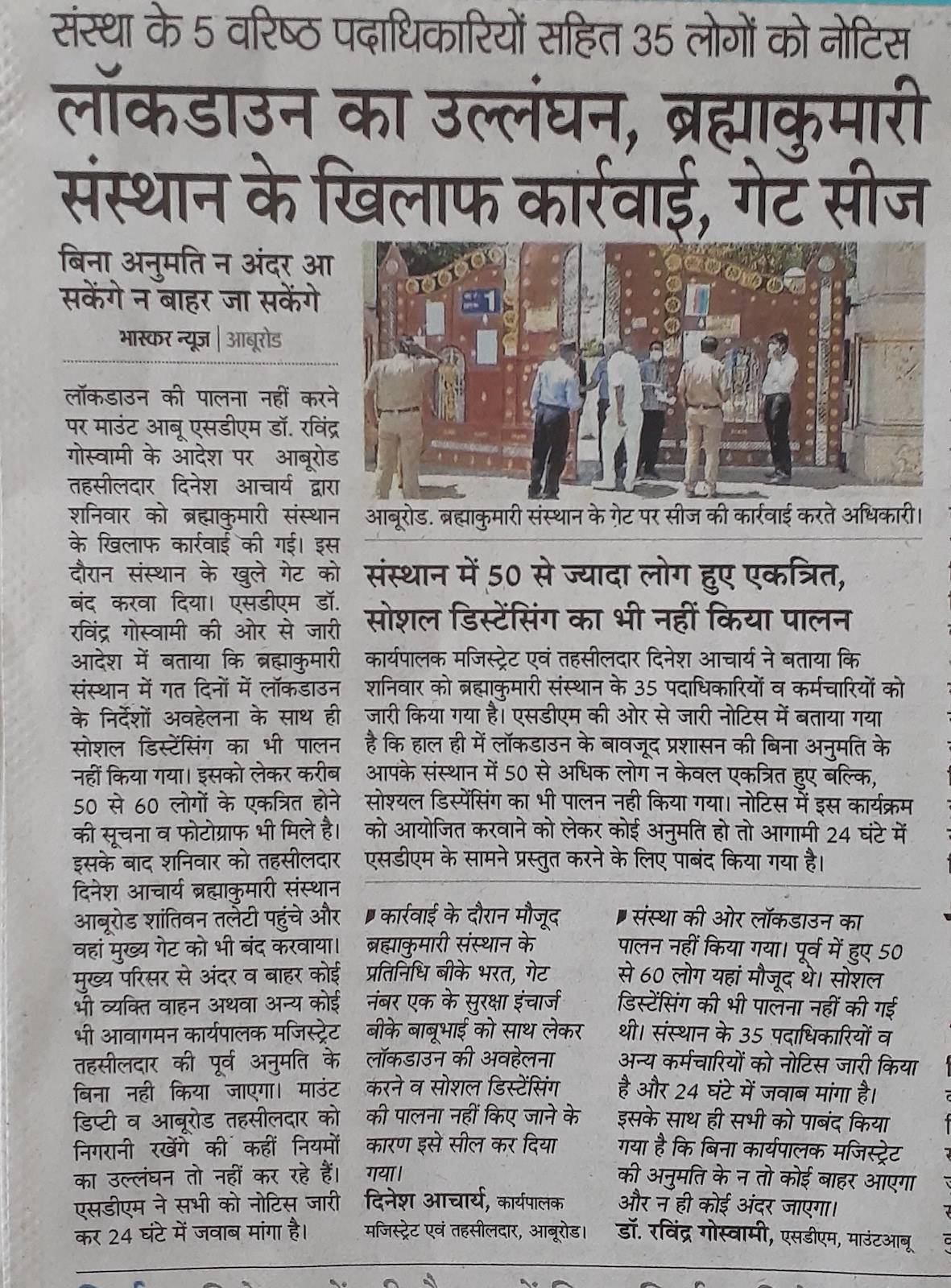 The Brahma Kumaris campus at Abu Rd has been shutdown due to violations of the lockdown caused by Covid-19, on the order of Sub-Divisional Magistrate Dr. Ravindra Goswami.