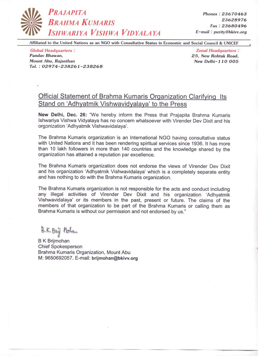 The Brahma Kumaris organization is not responsible for the acts and conduct including any illegal activities of Virender Dev Dixit and his organization 'Adhyatmik Vishwavidyalaya' or its members in the past, present or future. The claims of the members of that organization to be part of the Brahma Kumaris or calling them as Brahma Kumaris is without our permission and not endorsed by us."