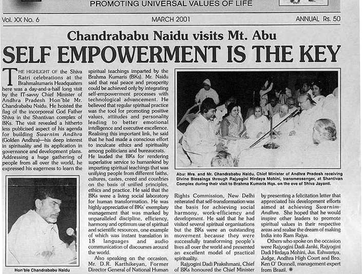 See please the attached article and photos from Purity, March 2001 about Chief Minister Chandrababu Naidu's a day-and-a-half long visit to Mount Abu.